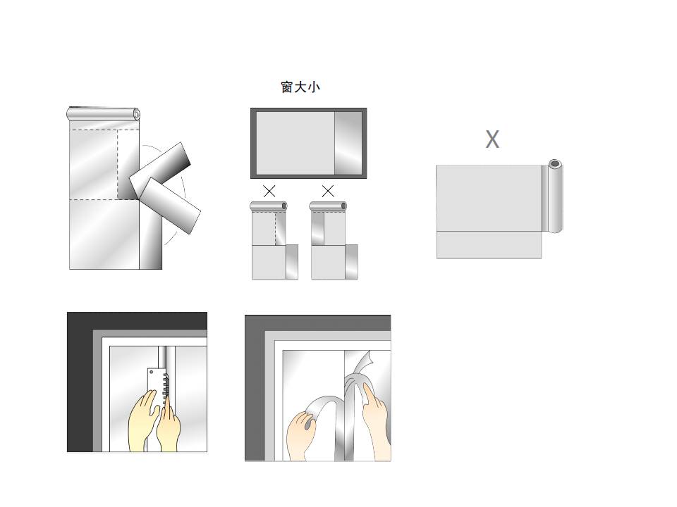 1.用膠帶把拉長的卷尺固定在牆壁上,再從紙箱中拉出窗膜,上端用膠帶固定。窗膜裁切尺寸為窗實際尺寸橫向和縱向各加5cm進行裁切。
