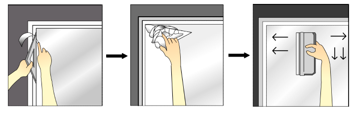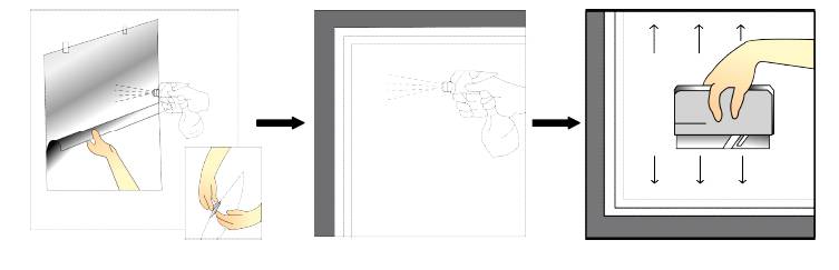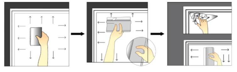 3.粘貼窗膜後再朝窗膜表面噴水溶液,用橡膠刮板使勁從中心往外刮,使窗膜和玻璃之間的水溶液和氣泡完全排出。刮板方向必須從中心往外一定方向刮。至少重複2次,直至確認水溶液和氣泡完全排出。