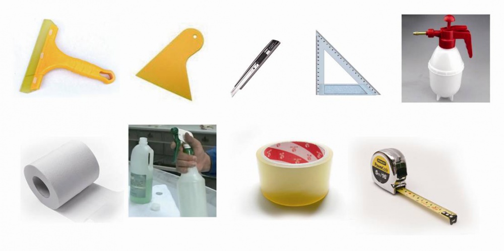 1.橡膠或牛筋刮板 2.硬刮板 3.美工刀 4. 三角尺 5. 噴水壺 6.捲筒紙 7. 洗潔精 8. 膠帶 9. 卷尺