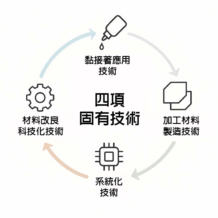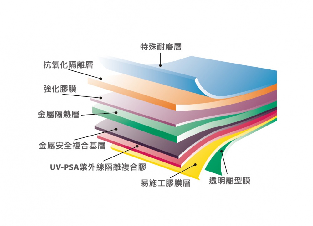 以四項固有技術為技術核心,在高次元層面運用先進奈米技術,來導入高透視金屬隔熱層、紫外線隔離複合膠層(UV-PSA),並結合獨有黏接著、塗佈及表面處理技術製造生產,具高隔熱、高防曬、高舒適特性。