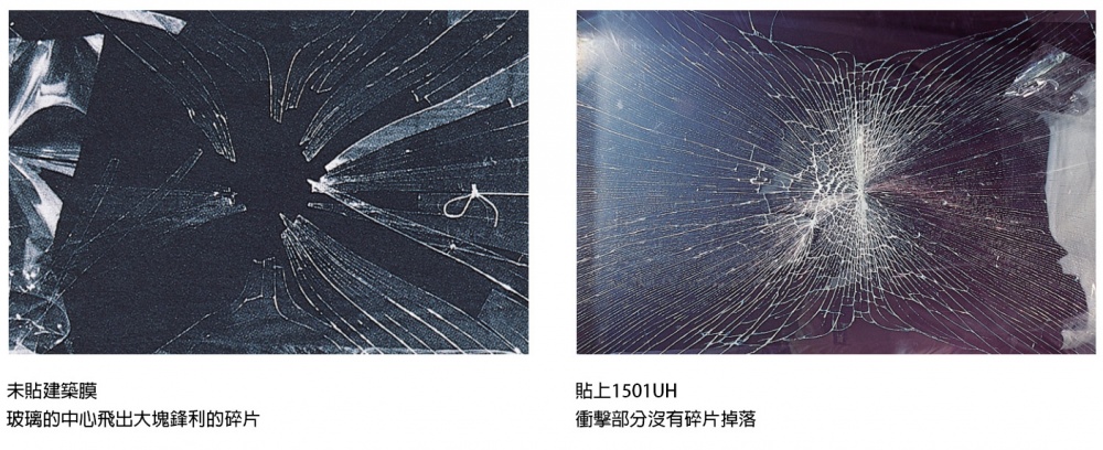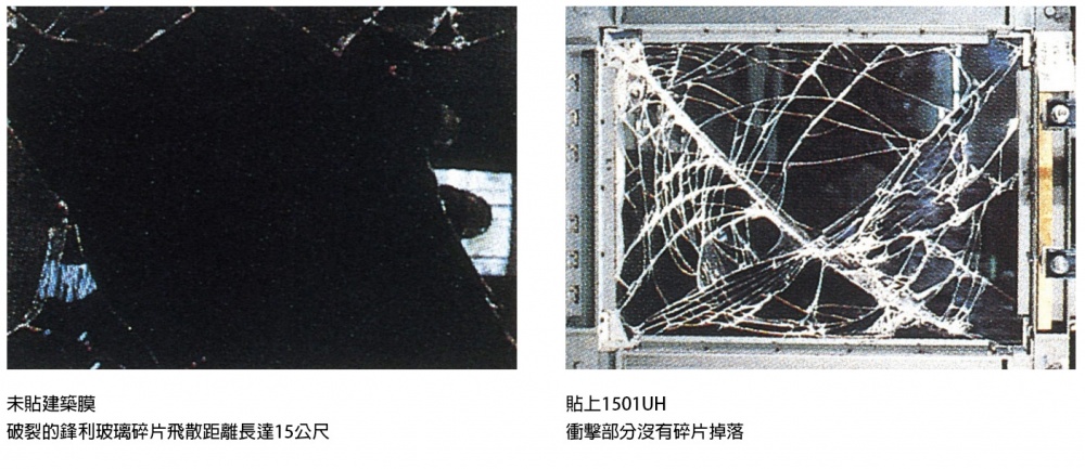 測試能提高玻璃防颱、耐震、抗壓性能,具有相當優越的玻璃碎片飛散防止效果。